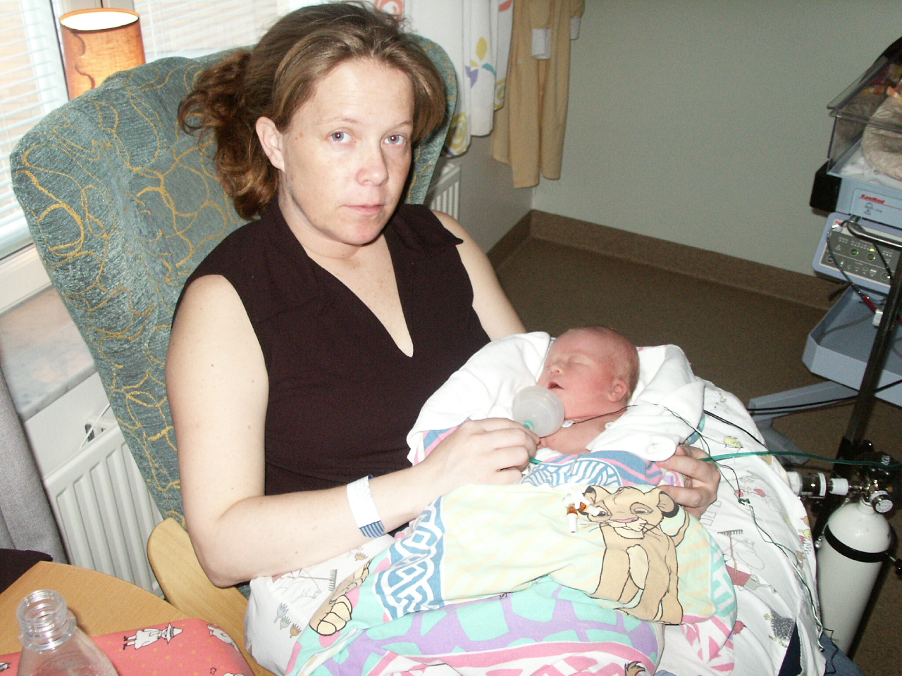 En trött morsa som sitter med syrgaskoppen i högsta hugg