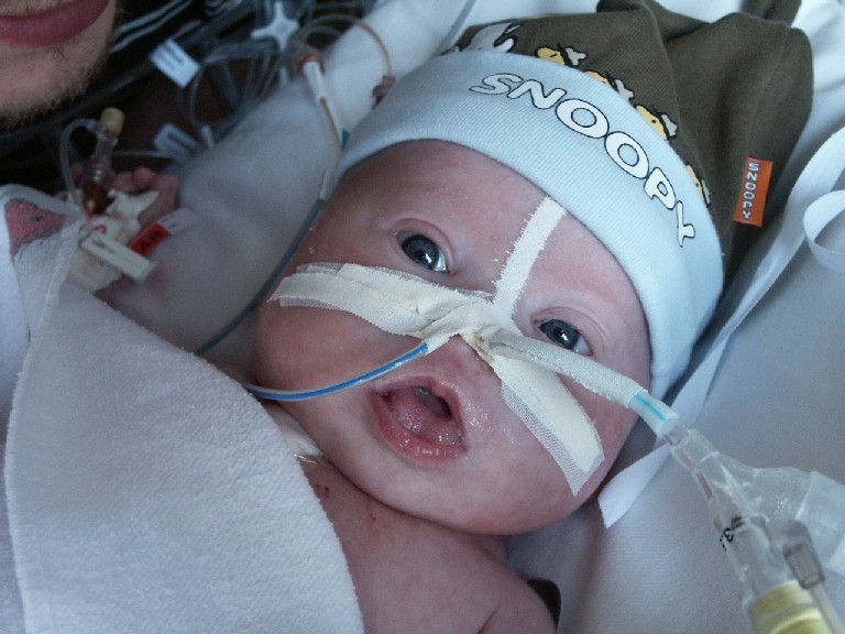 Efter frukost gick vi upp till Max på IVA-avdelningen. Idag hade han bättre färg i ansiktet och hade fått på sig en söt ”snoopy”- mössa för att hålla värmen litegrann. Personalen tycker han ser ut som en liten rappare. (hi,hi) Vi fick vara med då de justerade respiratorn så den skulle sitta bättre och så gjorde barnläkaren ett EKG, som ni kan se på bilderna här nere.