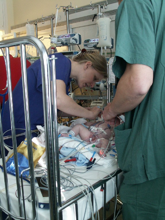 Kan nog inte med ord beskriva hur det kändes i mamma-hjärtat. Så vi stod där bägge två och höll lillhanden och pratade med honom. Man skulle helst vilja ta upp honom i famnen och bara gosa och mysa och kramas men man får ju nöja sig med hålla handen och lite pussar. Men de lät oss bara ha ögonkontakt en liten stund, sedan sprutade de i honom mer morfin och sömnmedel så att han inte blir för vaken och inte ha ont.