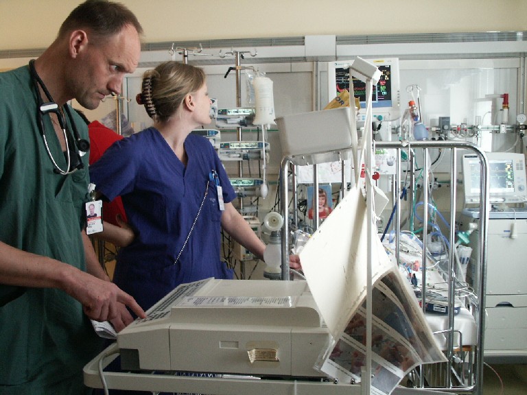 Det är facinerande att stå och titta på sjuksköterskorna och undersköterskerna som hela tiden står och gör någonting med Max. Med jämna mellanrum skriver de ner alla värdena på alla apparatur, de spolar rent slangar (och det är ju inte bara en !!!), de tar blodprover, de kollar alla dräneringslangar och kisspåsen med jämna mellanrum. De sitter inte still en minut. Hela tiden aktivitet. Så det känns ju otroligt tryggt med sådan övervakning.