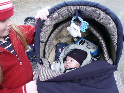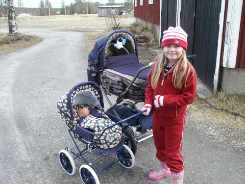 På eftermiddagen tog vi våran första promenad med vagnen ute. Fanny tog sin bäbis i sin vagn. Nu börjar vi få känna oss som en riktigt familj igen :-)