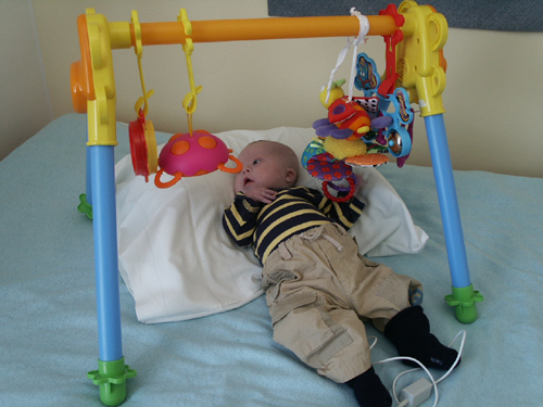 Max ligger under babygymmet och är helt fascinerad av sakerna.