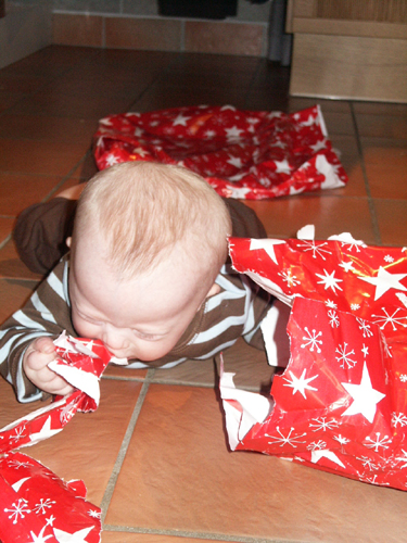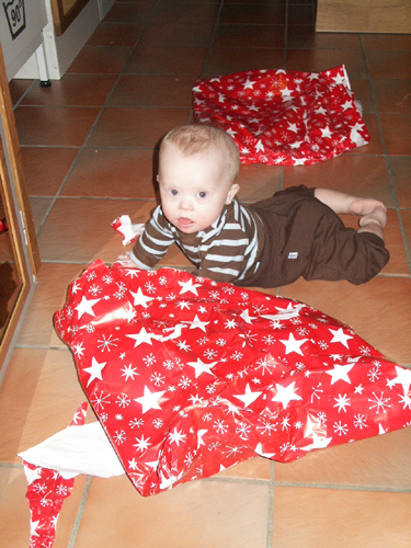 Här dyker han och leker ”titt-ut” under julpappret :-)