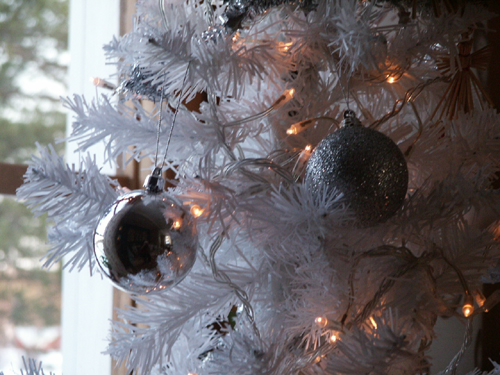 Våran vita julgran på kvällen och sista bilden i lite dagsljus