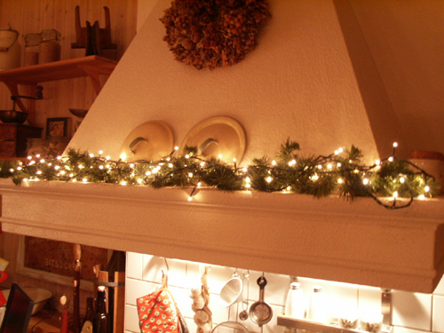 Dekorationer över spis i kök och runt ”fusk” fönster i hall.