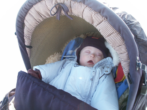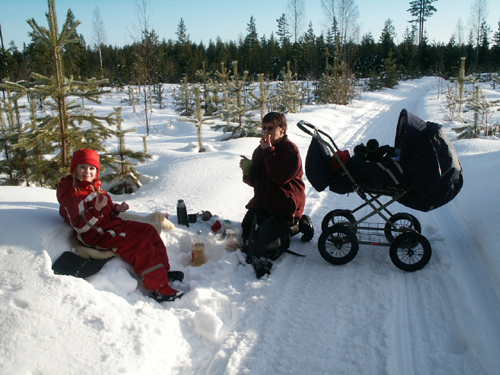 Jo, det gick faktiskt bra att skjuta barnvagnen där. Skoterspåren var hårda och fina. Så till slut hittade vi en solig plats, där vi slog oss ner för medhavd fika.