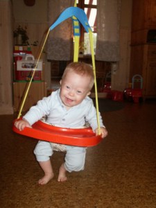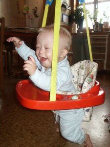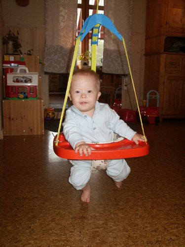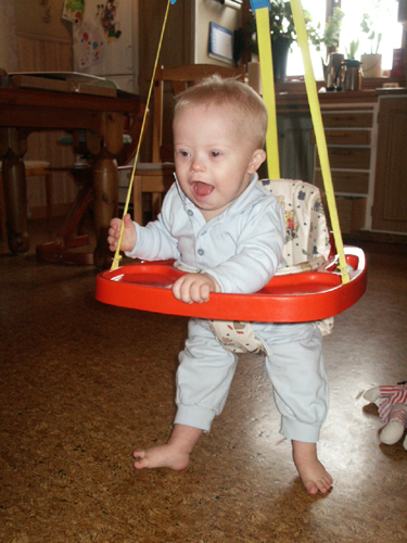 Jag var nämligen in på forumet på familjeliv och frågade om någon hade något tips på någon hoppgunga för äldre barn. Eftersom Max inte vill stå på sina ben än, så känns det så viktigt att stimulera honom under fötterna, så han känner benen, så mycket som möjligt. Men han börjar vara för stor för en vanlig hoppgunga och så har jag så svårt att orka få honom i & ur den tajta kroppsstrumpan. Så då fick jag ett svar av Malin att hon hade haft en för flera år sedan och att den bara låg och tog plats. Så det kändes som en chansning att se om den skulle fungera för Max.
