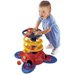 1. Vi har haft ett sånt ”torn” till barnen. Uppskattat långt upp i åldern. Tyvärr provade någon av de större barnen stå på den så den gick sönder. Den är värd sina pengar, kul då den spelar då de släpper bollarna.