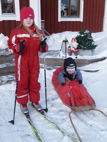 Vi for bara efter vägen. Men ingen höjdare. Det var ganska mycket motvind, det var ruskigt bakhalt för mig och så var stavarna alldeles för höga. Så det slutade med att jag fick koppla bort skidorna och gå och bära skidor och stavar istället. Det gick det med. Vi fick en paus hos ”moster” Erika med kaffe och fika. Julmysigt och fint!