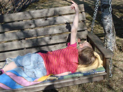 Jag tycker det var så mysigt då barnen bäddade ner sig i den stora trägungan vi har mellan ett par björkar på gården. Jag hade länge ”trånat” efter en sån gunga, som man sett i så många utländska filmer, då de har dessa på verandan. Det är morfar som har snickrat den till oss för några år sedan och den är så härlig på sommaren, för då blir det en härlig skugga under hängbjörkarna, lite som en koja.