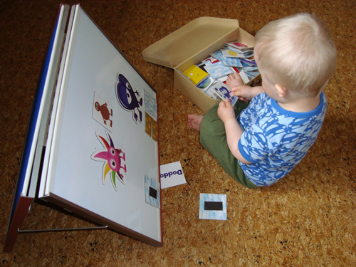 Sedan när storasyster lessnade så satt Max själv på golvet med sin låda med olika bilder med magnetbaksida och satt upp på tavlan. ”Babblarna” är favoriterna =)