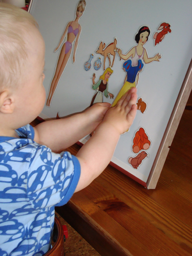 Så kom jag ihåg att vi hade kvar magnetdockor sedan tidigare, då Fanny var mindre. Det är Askungen, Snövit och Barbie, som man kan klä på kläder och dylikt. Så det roade faktiskt bägge en stund. Dessutom gick det väva in lite ”träning” var kläderna sitter på kroppen =)