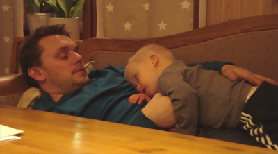 Så här mysigt hade Max med pappsen på kökssoffan