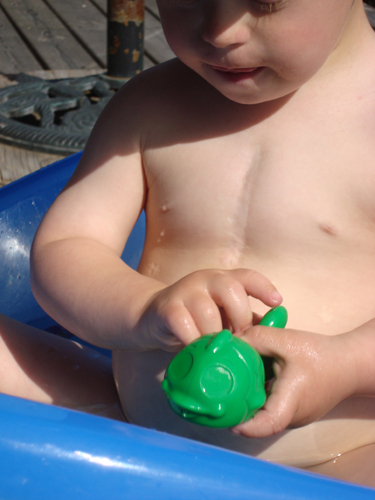 Här ser man Max ärr från hjärtoperationen på bröstet