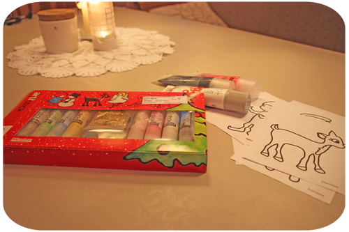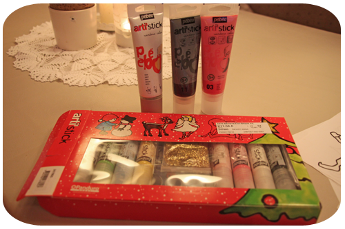flera ”tubpennor” med fönsterfärg och även julmotiv
