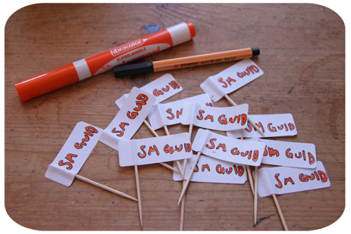 dottern har skivit på små flaggor för att sedan