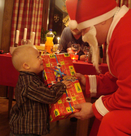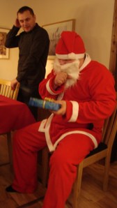 började dela ut julklappar. Ser ni Max smile…..