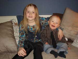Här är barnen redo för en julafton hos farmor och farfar….