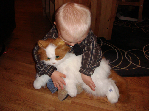 ….storasyrran fick nästan en riktig katt i julklapp. En ”furreal” katt som är ganska verklig. Den jamar, spinner, tvättar morrhåren, strycker sig emot dig, blinkar med ögonen. När man stryker den nog länge på ryggen spinner den och vänder sig sedan på rygg och somnar =)