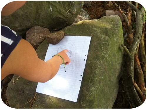 på stenen och han kollar noga på den och