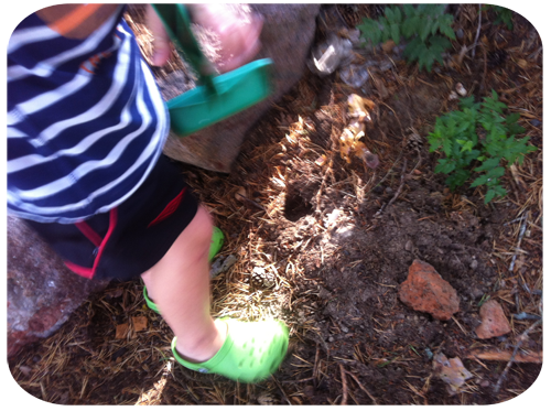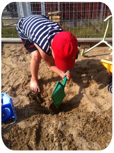 …så han hämtade först en spade från sandlådan,