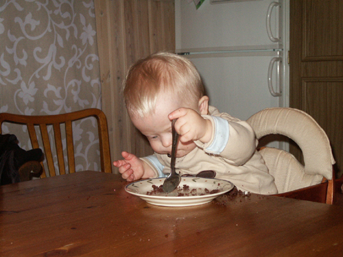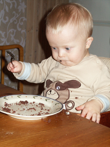 Här är några bilder på en koncentrerad Max som äter kaka med sked. Han även nu börjat kunna teckna och rent sagt fråga efter ”kaka” =)