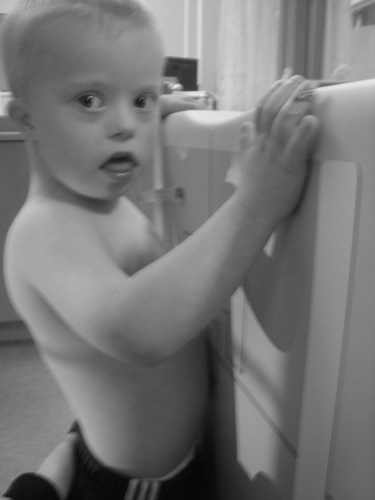 och flinar och säger ”…mamma säga så… jag sjuk”.