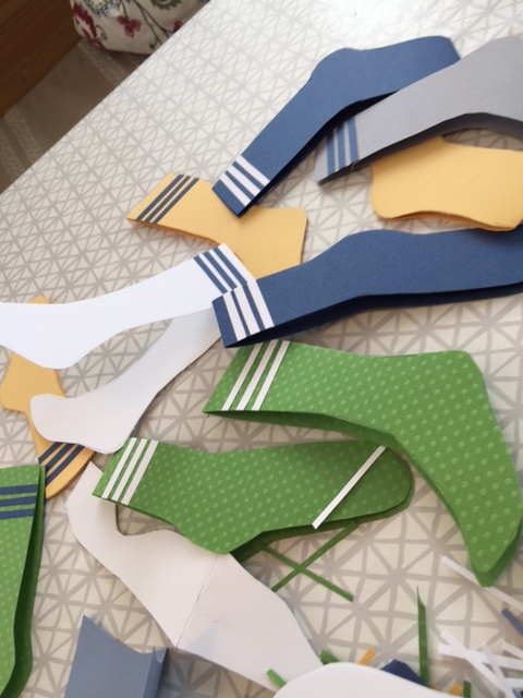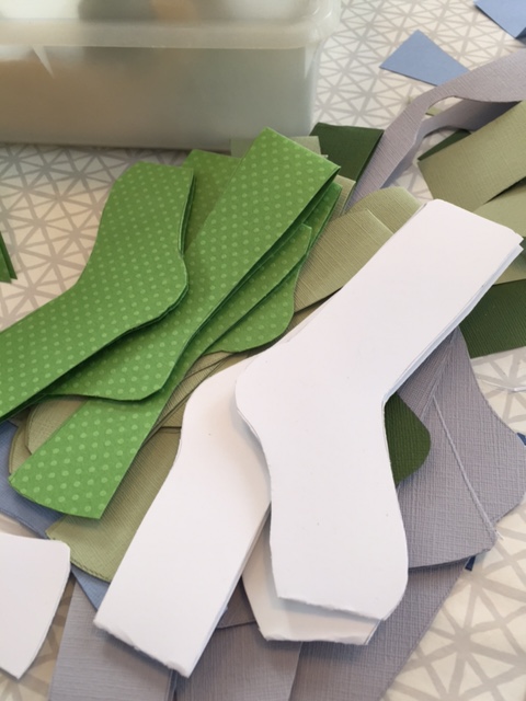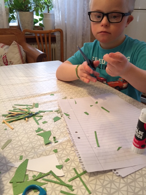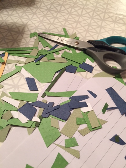 han har suttit och klippt remsor, bitar