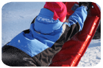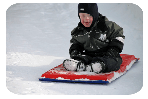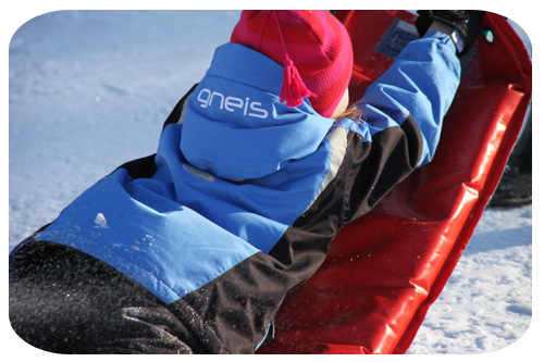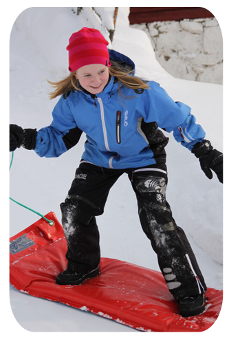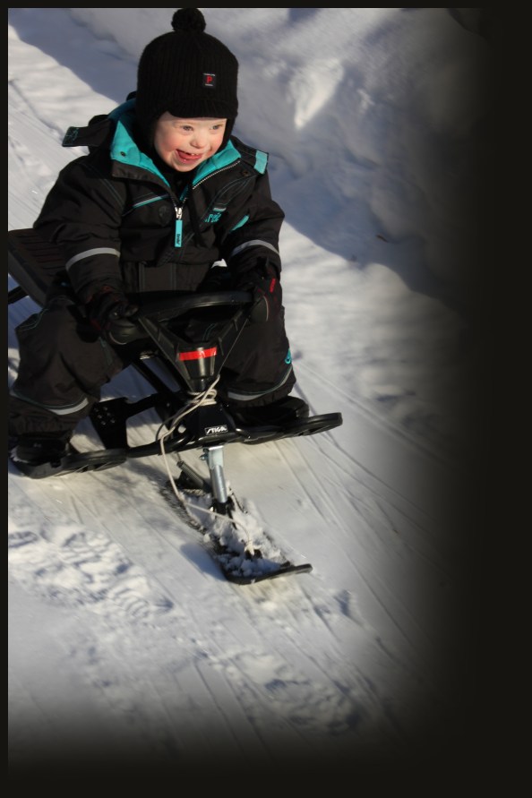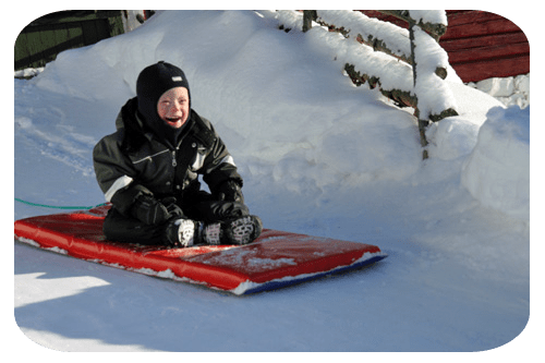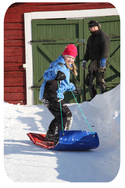 han far nerför backen. Han har ju tidigare mest velat åka madrass,