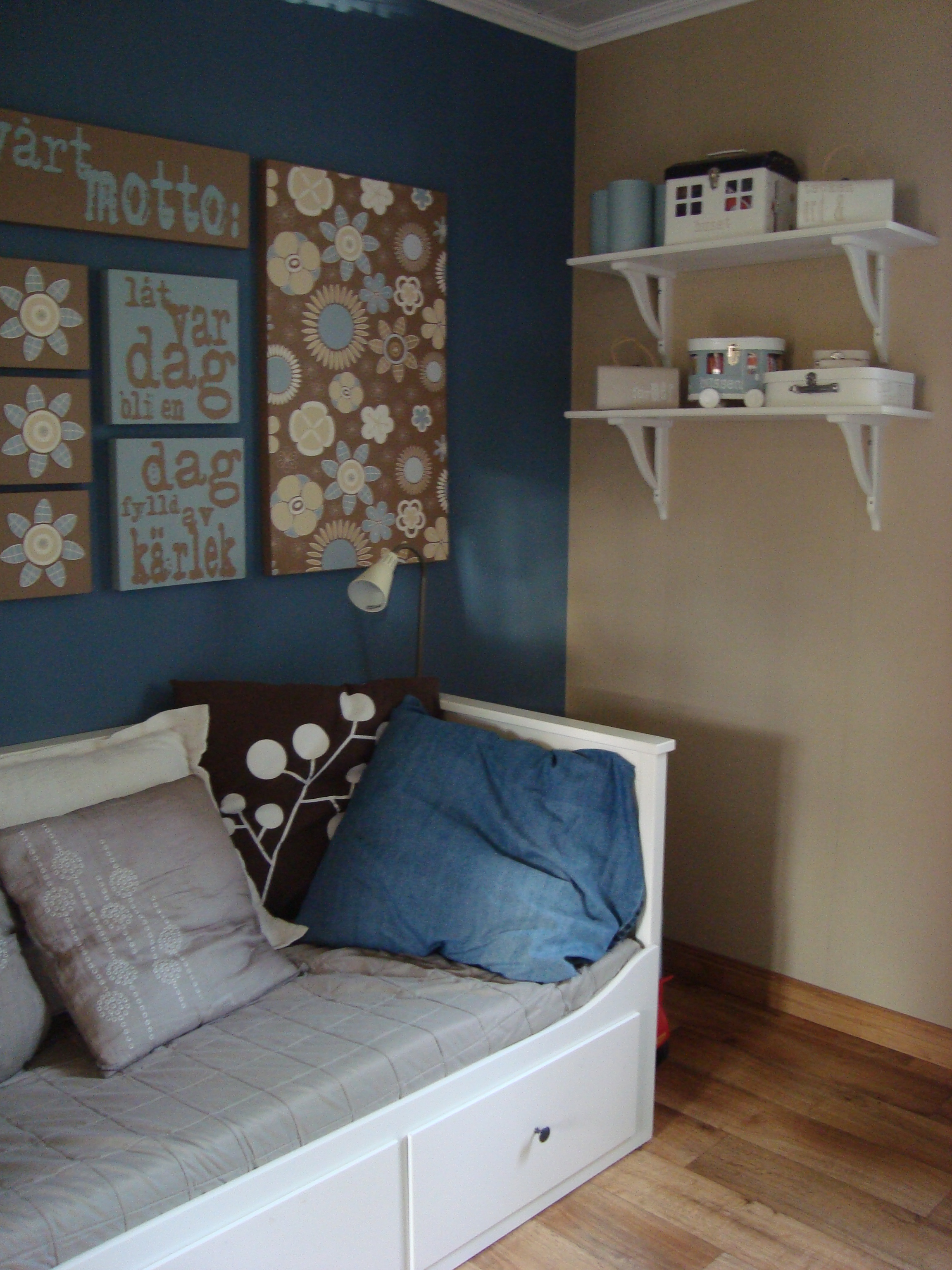 Sedan upp på väggen med sängen och så ”bäddade” vi